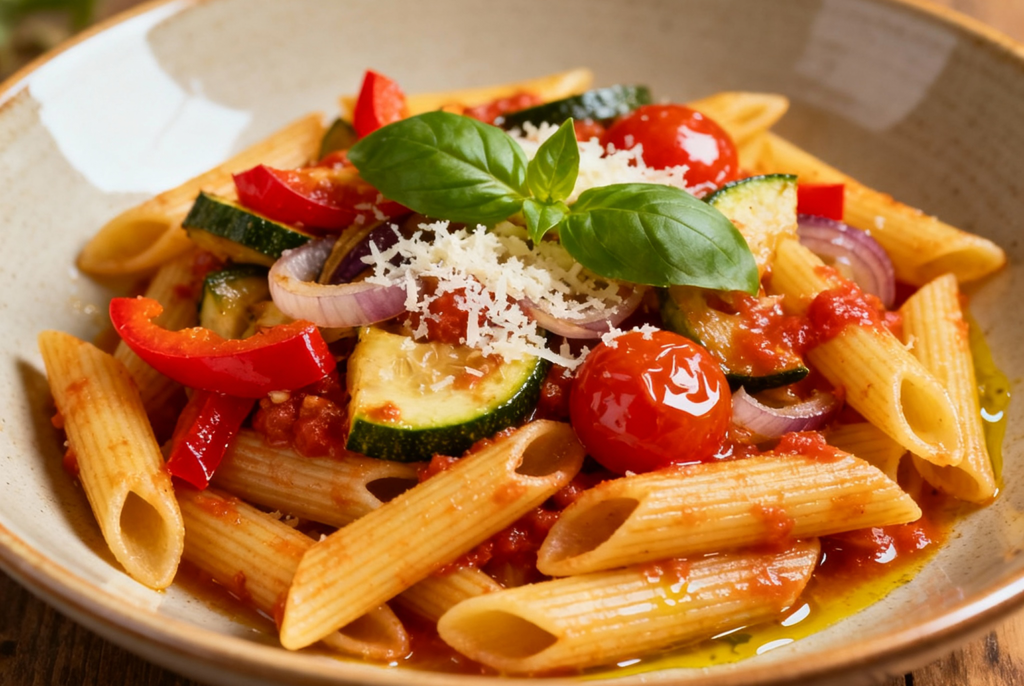 This recipe is a balance of comfort and nutrition, perfect for chilly evenings. It features roasted seasonal vegetables, a rich tomato base, and a touch of cream for that satisfying cozy vibe. The penne absorbs every bit of flavor, while fresh herbs keep it bright and refreshing.