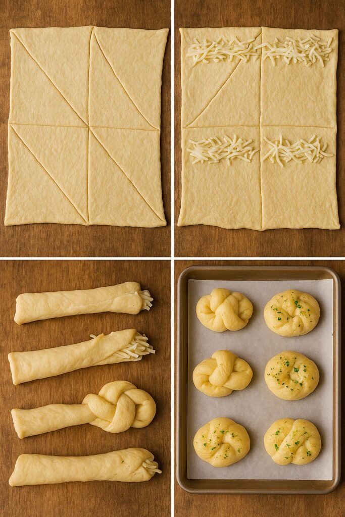 Gently tie each strip into a loose knot. Don’t worry if it looks rustic—imperfections make them charming. - Brush with garlic butter