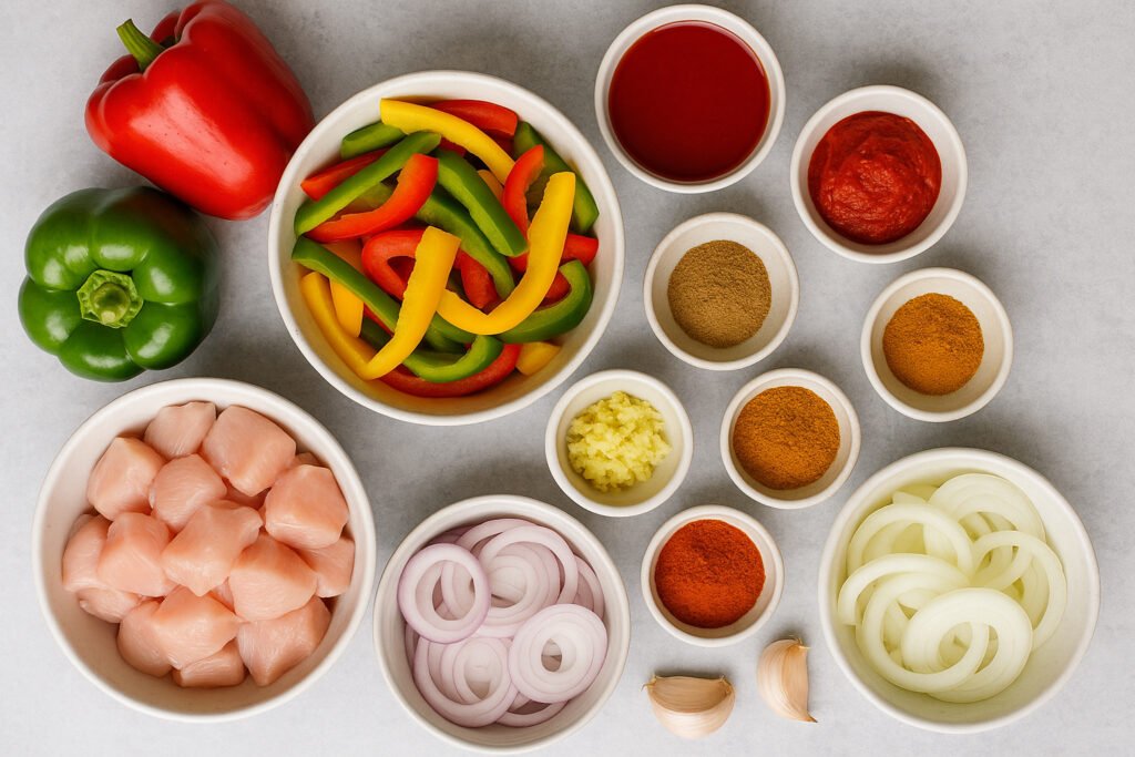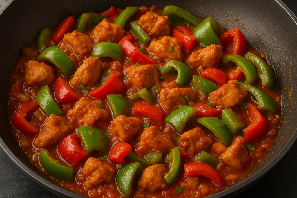 The nice part? It doesn’t chain you to the stove. Think of it more like a quick stir-fry with personality: tender chicken, crunchy bell peppers, a punch of garlic and ginger, all wrapped up in a tangy tomato sauce. It’s fast, a little fiery, and a whole lot more fun than plain old grilled chicken.