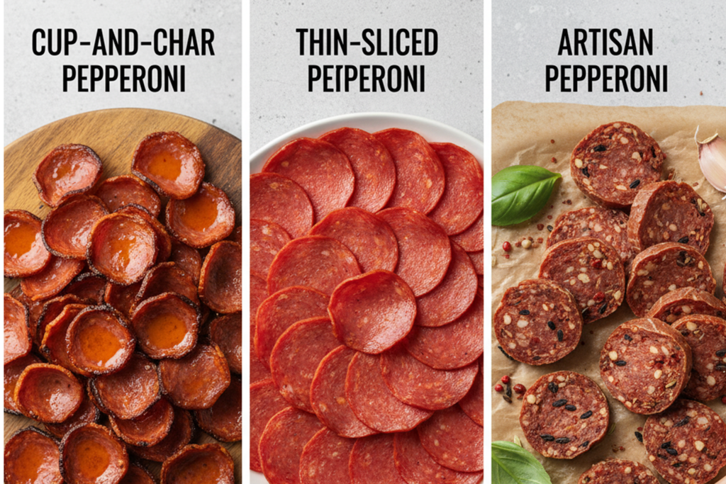 - Cup-and-Char Pepperoni – Small, thicker slices that curl into crispy cups when baked. Smoky, crunchy, and intensely flavorful.